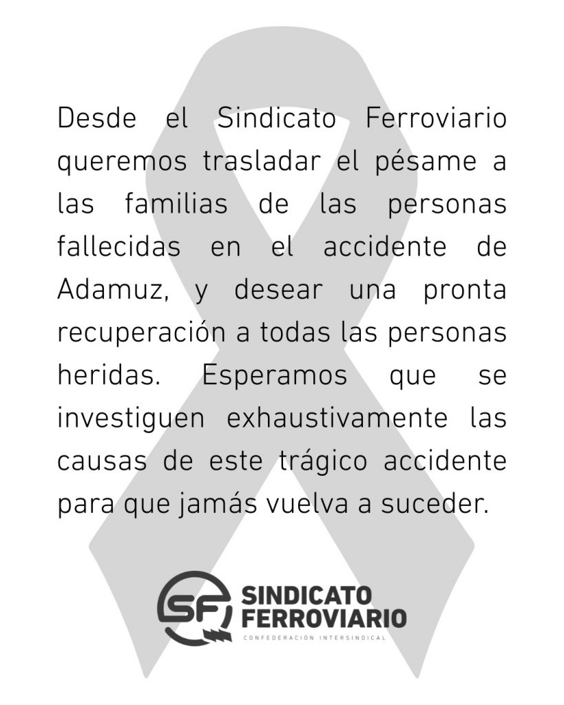 Desde el Sindicato Ferroviario y la Intersindical de Trabajadores y Trabajadoras de Aragón queremos trasladar el pésame a las familias de las personas fallecidas en el accidente de Adamuz, y desear una pronta recuperación a todas las personas heridas.